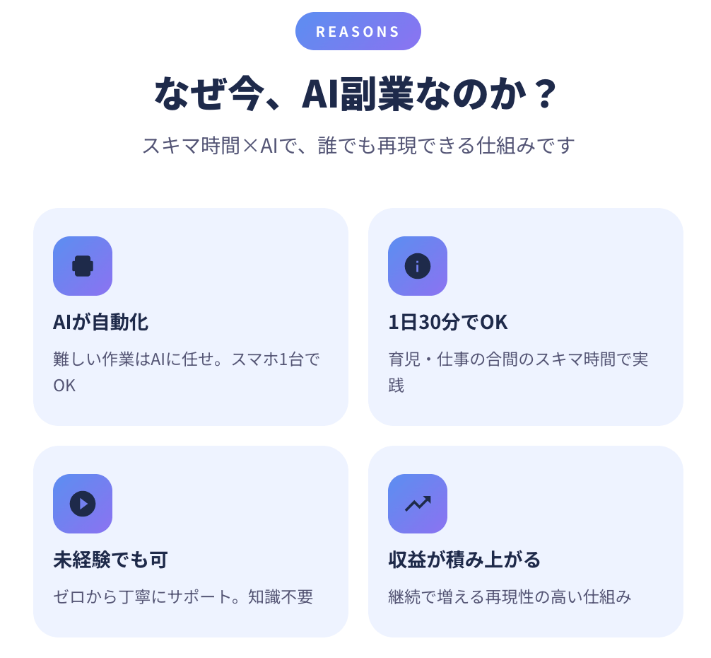 AI副業マニュアルやテンプレート、個別サポートといった初心者にも嬉しいサービスも充実しています。