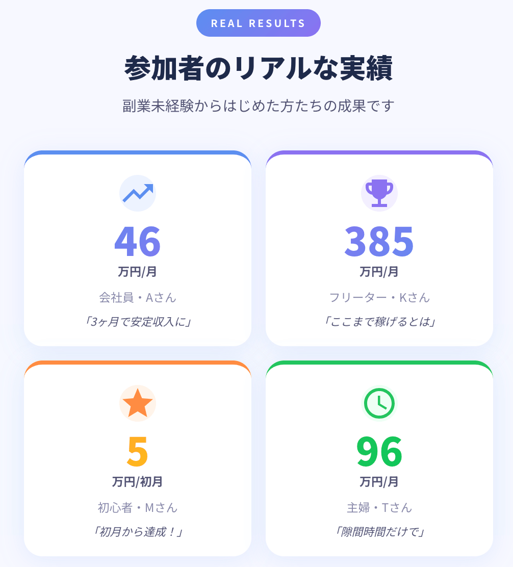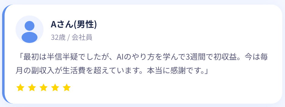 最初は半信半疑でしたが、AIのやり方を学んで3週間で初収益。今は毎月の副収入が生活費を超えています。本当に感謝です。