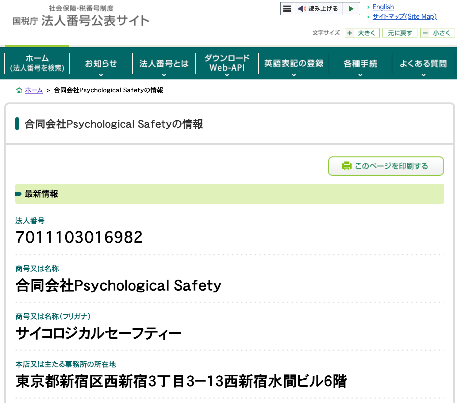 合同会社Psychological Safetyは、しっかり法人登録されていて国税庁のサイトで確認することができます。