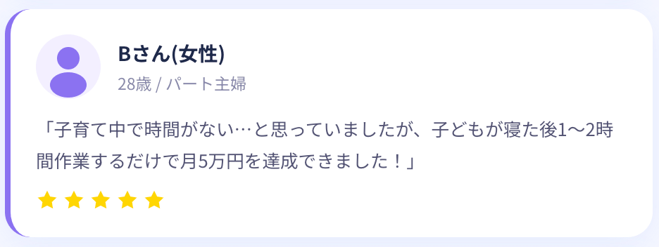 子育て中で時間がない…と思っていましたが、子どもが寝た後1〜2時間作業するだけで月5万円を達成できました!