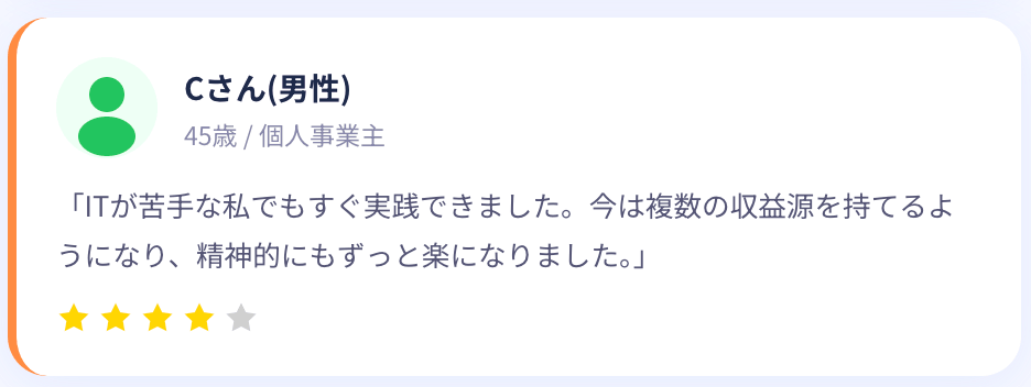 ITが苦手な私でもすぐ実践できました。今は複数の収入源を持てるようになり、精神的にもずっと楽になりました。